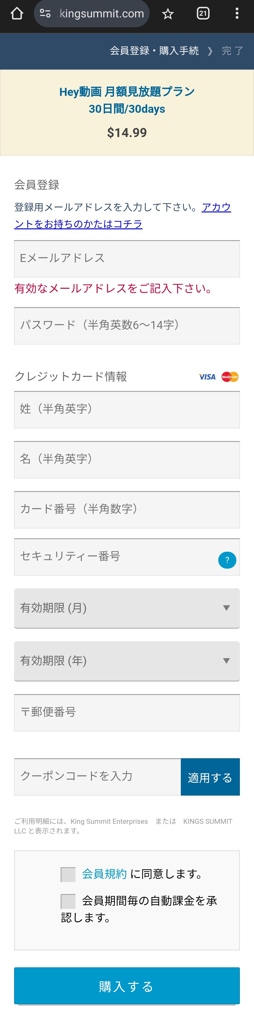 Hey動画月額見放題プランの支払いは、KINGSUMMIT社という決済代行会社を通じて行われます。カード明細には「Hey動画月額見放題プラン」や成人サイト名は表示されず、代わりに「KINGSUMMIT」という名前で記載されます。